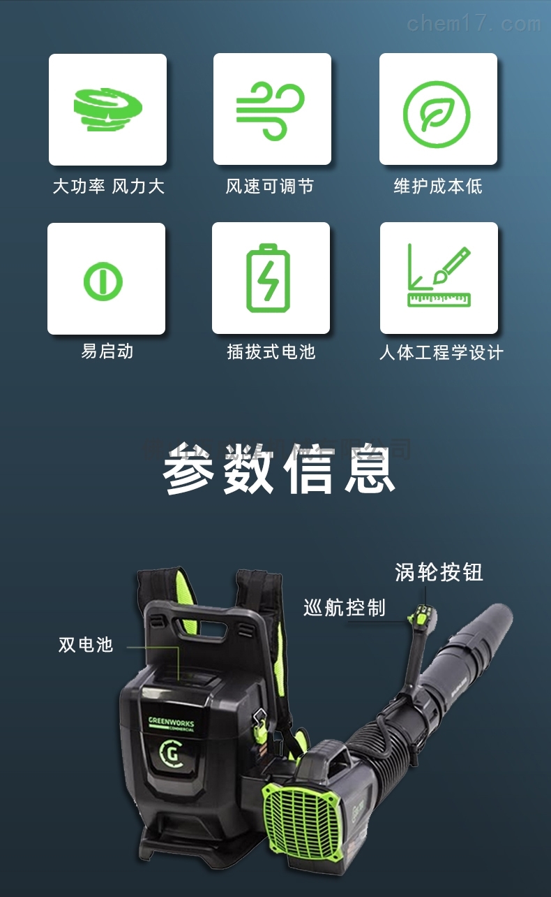 Glibo 82v blb486雙電池吹風機產品參數:品牌:greenworks/Glibo產品型號:82v_blb486風速:73.8m/s風量:19.53m3/min功率:1.6kw電壓:82v整機重量(無電池):7.2kg產品類型:全新適用場所:戶外加工定制:無售后服務:一年內保修電機類型:無刷電機